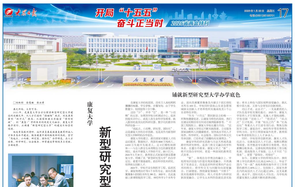 康之所向,大有可为。2025年,是康复大学全方位探索新型研究型大学建设的关键之年。从人才引进的“强磁场”效应,到生源质量的“跃升式”提高;从国家级重点实验室“零的突破”,到“康复+”学科体系的深度交叉融合,康复大学稳步前行,正朝着“新型研究型大学”的建设目标坚实迈进。地处青岛胶州湾畔,这所肩负着我国康复教育科技人才体系高水平建设、服务健康中国战略使命的高校,坚守“高起点、小而精、研究型、国际化”办学...