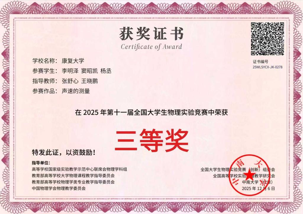 康大学子在第十一届全国大学生物理实验竞赛(创新)和省大学生物理创新竞赛获佳绩