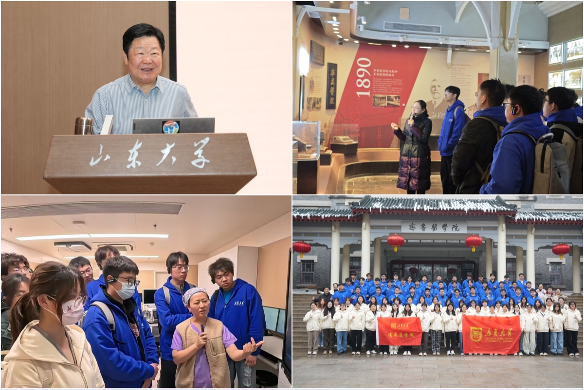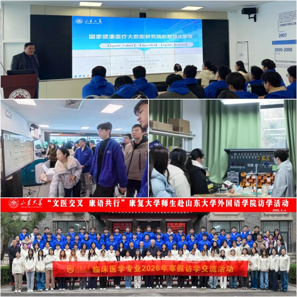 秉持“医学+X”交叉融合的办学理念,此次访学专门安排学子走进山东大学多校区、多学院,感受跨学科融合的科研与育人氛围。在洪家楼校区外国语学院,学子们聆听发音方式在言语康复临床实践中的应用,参观山东大学语言康复中心,真切体会到语言学科与康复医学深度交叉的温度与价值;在兴隆山校区公共卫生学院,学子们聆听薛付忠院长的专题分享,深入了解学院“数据驱动、算法指引、转化为聚、AI转型”的办院理念及发展历程,直观感受健康医疗大数据与人工智能在医学领域的创新应用与市场转化成果;在千佛山校区高等医学研究院,学子们先后走进陈子江院士、孙金鹏院长的实验室,感受深耕医学专业、工科助力医学研究的浓厚科研氛围,通过医工交叉学科讲座,了解人工心脏、光反应治疗肿瘤等前沿医学成果。