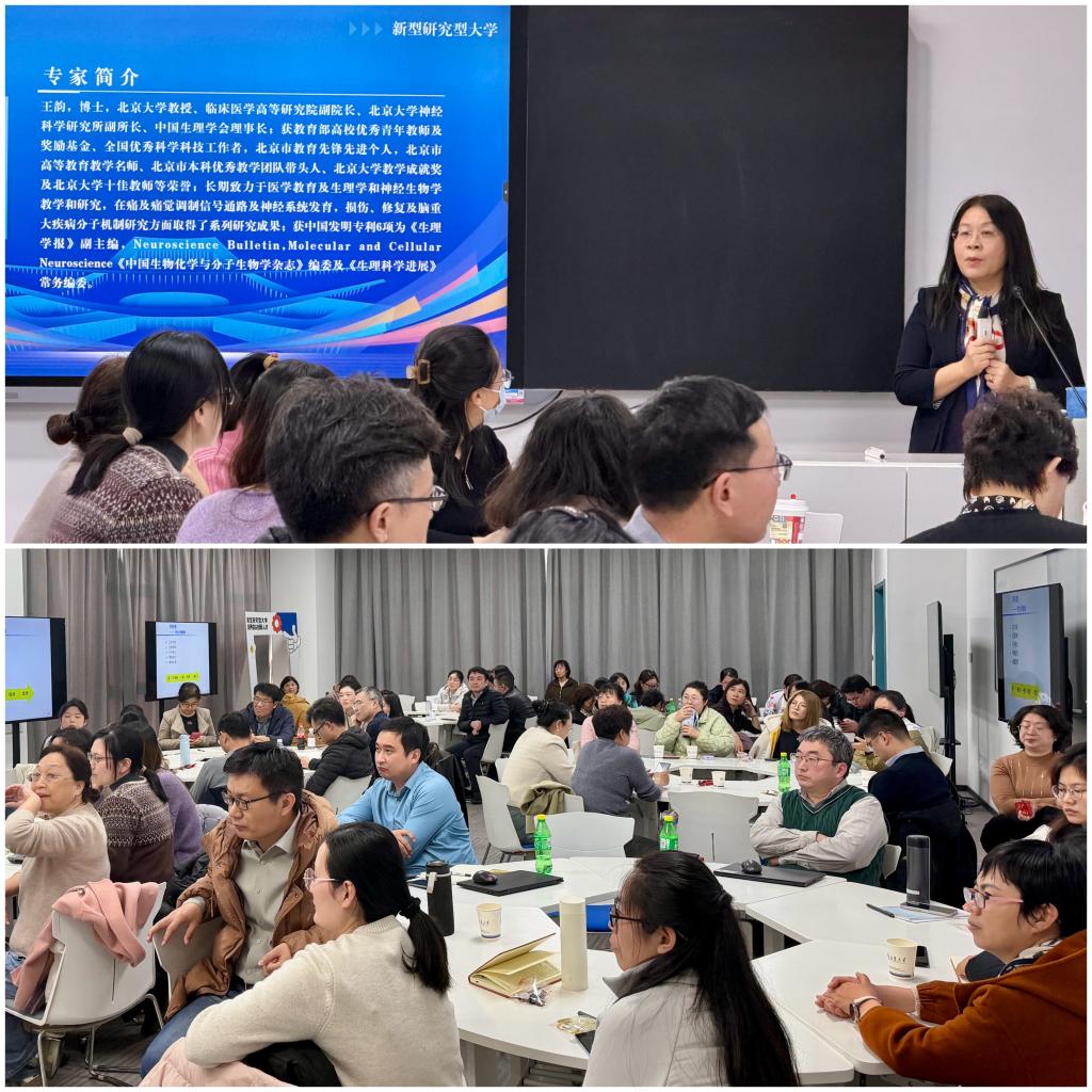 培训分设两个模块。在整合课程专题培训中,王韵教授结合北京大学在医学整合课程领域的探索历程与实践经验,系统阐述了整合课程的设计理念、实施路径与评价机制,为参训教师提供了清晰的建设思路。在PBL案例培训环节,针对本学期要开展的神经系统整合课程,王韵教授以一个阿尔茨海默病案例为例,深入剖析了PBL的核心内涵要素、案例编写策略及课堂组织技巧,并进一步延伸至医学模式的变革与医学教育模式创新,拓宽了参训教师的教学视野。整场培训既体现出深厚的学术积淀,又彰显出鲜明的实践导向。培训现场互动热烈,多位教师与王韵教授进行深入探讨。参训教师普遍表示,此次培训深化了老师们对整合课程与PBL的理解,为今后优化课程设计、创新教学模式提供了极大启发,培训效果极佳。