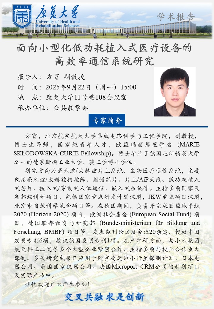 学术报告:面向小型化低功耗植入式医疗设备的高效率通信系统研究