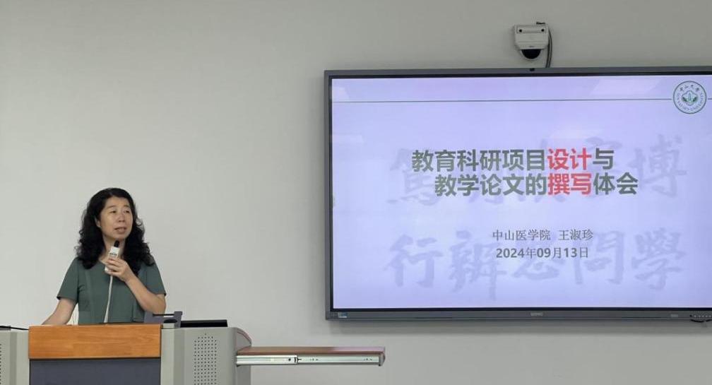 学校特邀中山大学中山医学院王淑珍副院长作专题报告,王院长以“教学科研项目设计与教研论文的撰写体会”为题,深入阐述了教育科学研究作为教师职业发展和个人价值提升的必由之路的重要性,细致探讨了教育科学研究的实施路径,同时就如何撰写高质量教学论文给出了建议。