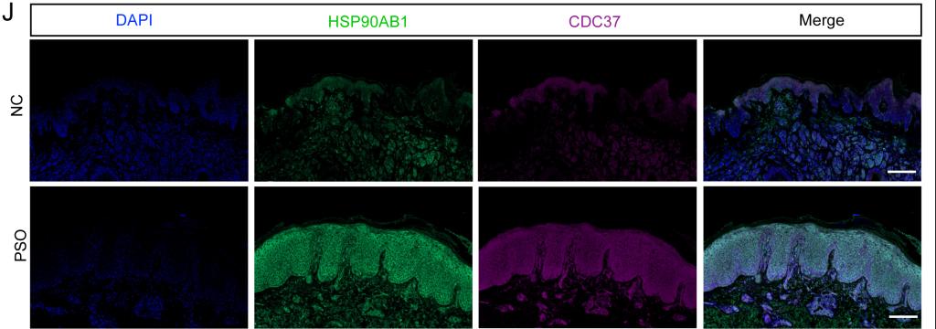 为明确制剂的作用原理,研究团队通过新生蛋白质组学分析,锁定了热休克蛋白90 α 家族 B 类成员1(HSP90AB1)这一核心靶点——该蛋白在银屑病患者皮损中表达显著升高,是推动疾病发展的关键分子。