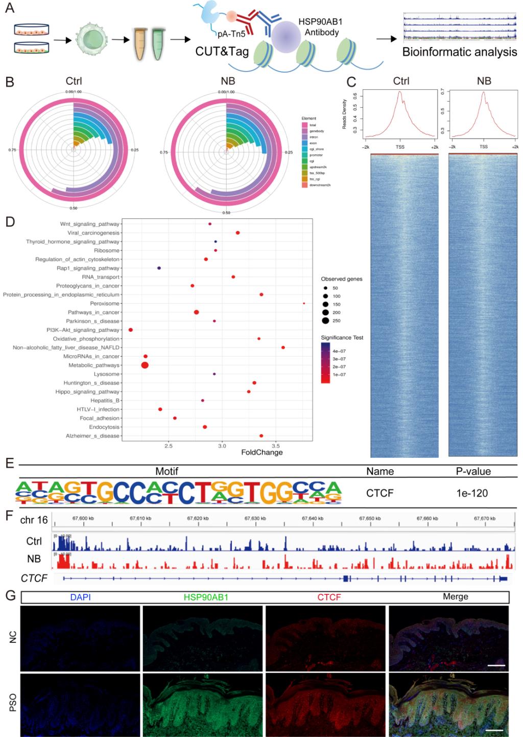 (二)抑制HSP90AB1 转录:前期实验结果发现NB下调了HSP90AB1的蛋白水平,通过CUT&Tag技术表明NB可下调其转录因子 CTCF 的表达,进而直接减少 HSP90AB1 的生成;
