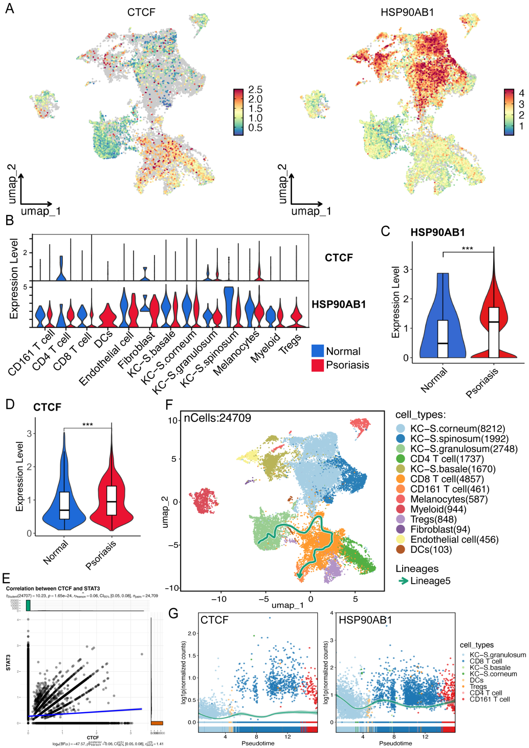 图7 银屑病患者单细胞数据中CTCF和HSP90AB1的调控分析