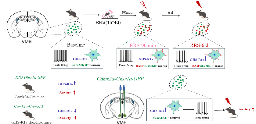 焦虑障碍是全球最常见的精神疾病之一,但神经机制尚不明确。本研究首次明确了GHS-R1a(生长激素促分泌素受体1a)通过调控下丘脑腹内侧核(VMH)αCaMKII+神经元兴奋性参与焦虑行为的发展,提出了GHS-R1a作为治疗焦虑障碍潜在靶点的新概念。未来可基于这一机制开发针对性药物干预策略,尤其是在创伤后应激障碍(PTSD)等疾病中具有重要应用前景。