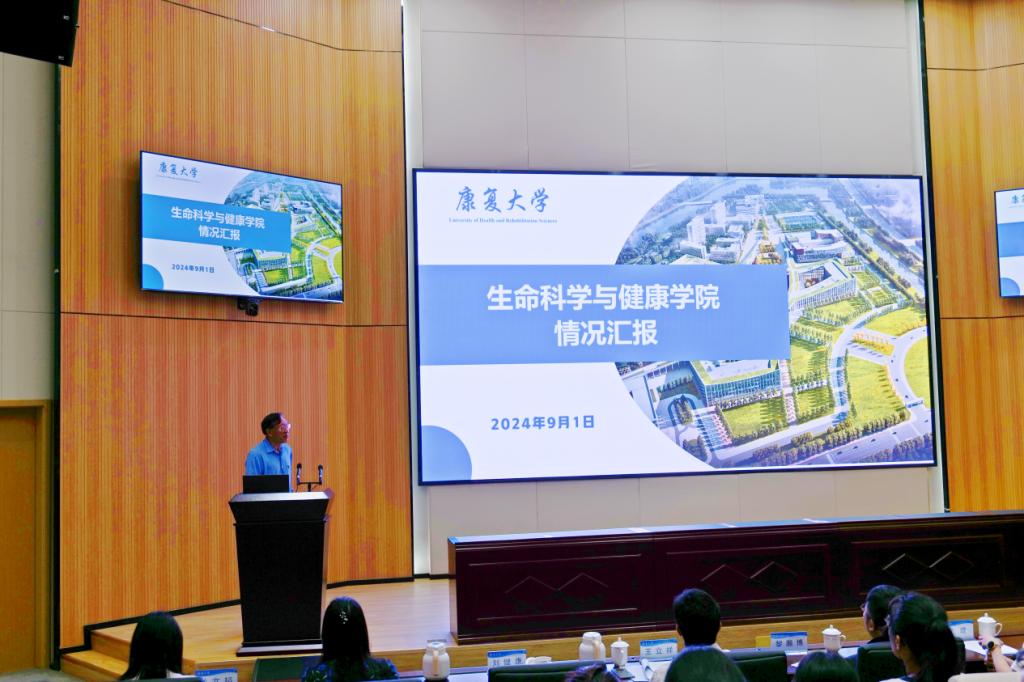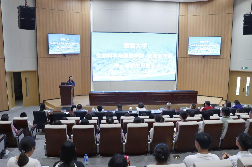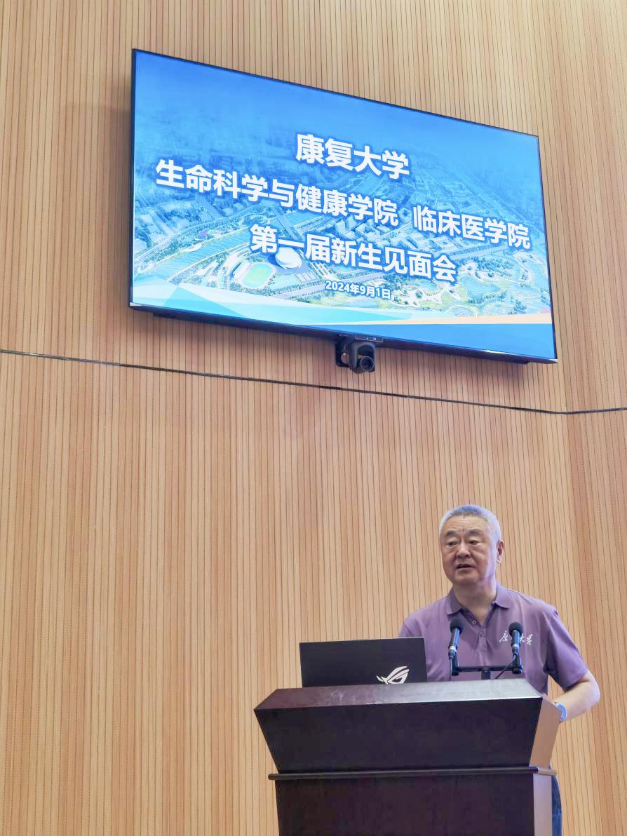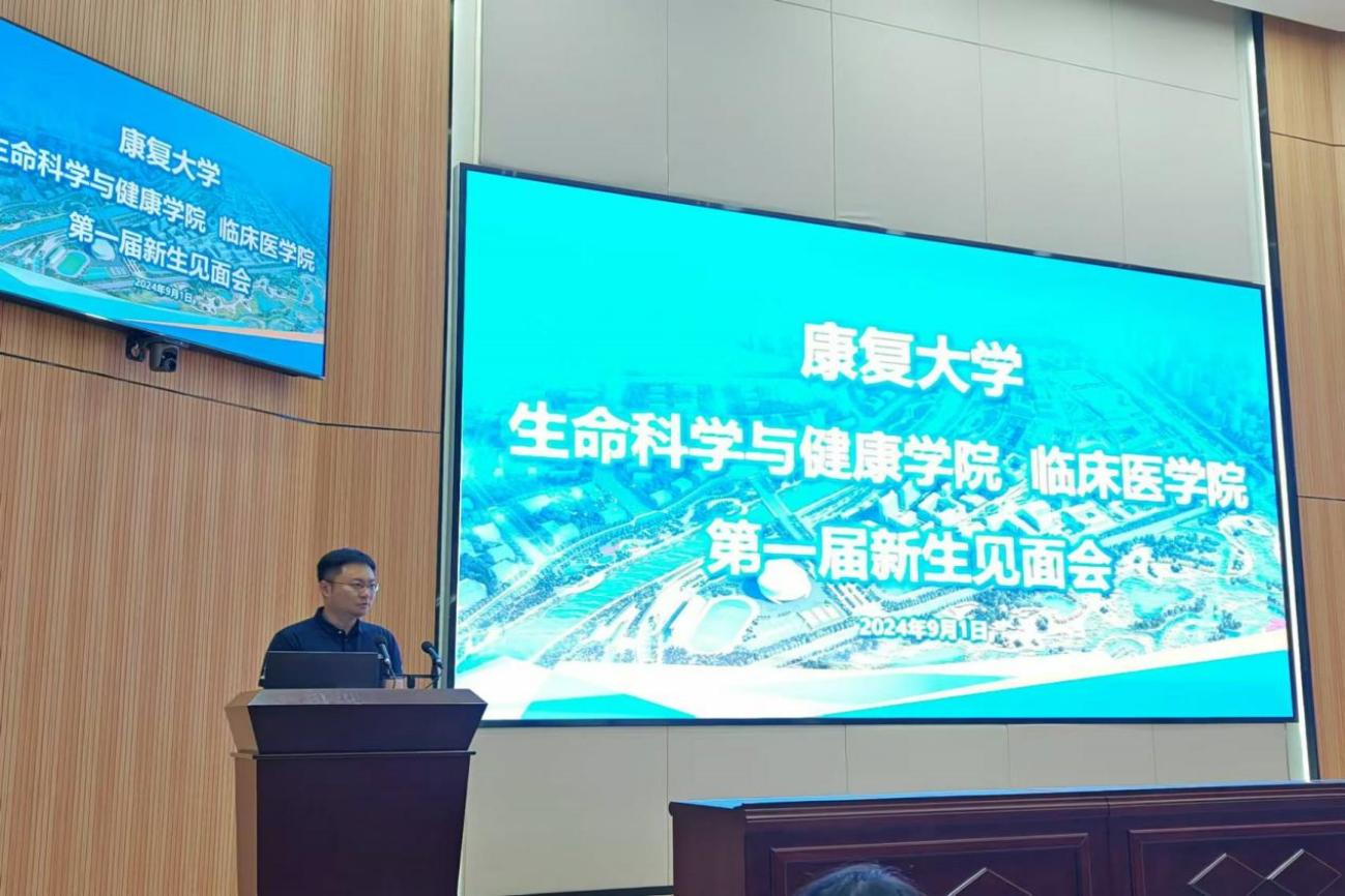 刘健康从学院筹建与发展历史、学院现状、专业情况等方面做了报告。他从师资、专业、科研成果等方面介绍了学院的基本情况,并以“为何选择生命科学”以及“为何选择康复大学”两个问题开头,激发了学生们对学院特色、专业学习及未来愿景的深刻思考。他强调,康复大学具有聚焦康复领域、多学科交叉融合等特色优势,鼓励同学们在学校勤奋学习,勇于探索,丰富知识储备,培养科研能力和实践能力,与学校的发展共成长、共进步。