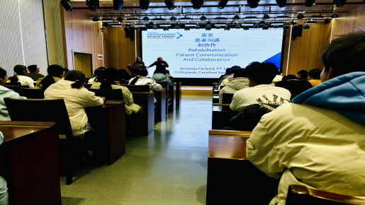 Amanda老师以《康复患者沟通和协作》为主题,以现场两位有肌骨疼痛的老师和学生为例,风趣幽默、形象生动地向大家介绍了如何与患者沟通、如何帮助患者建立功能相关的康复目标,如何考虑为患者设计出院计划等内容。康复物理治疗及康复作业治疗专业学生通过现场案例分析,积极提出问题、参与讨论,现场气氛非常活跃。通过交流,学生们对于康复治疗工作方式和重点的新观念、新发展有了更加全面的认识和理解。