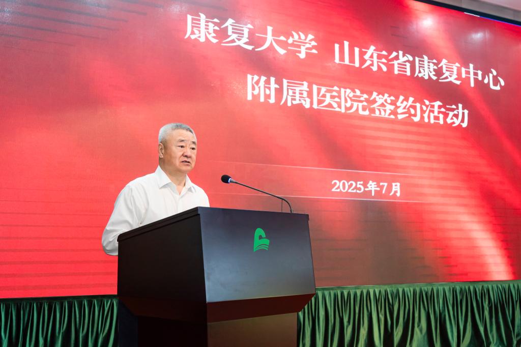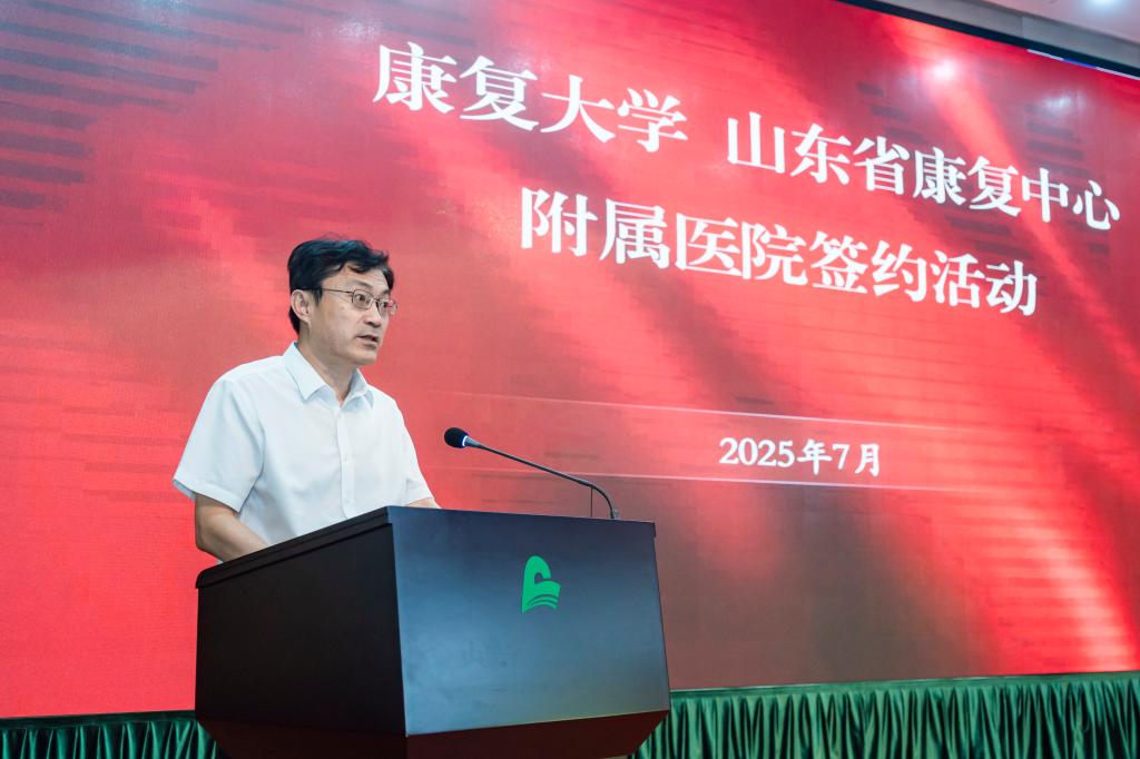 董尔丹代表学校对省卫健委、省教育厅厅长期以来对康复大学的关心、支持和帮助表示感谢。他指出,康复大学是我国唯一一所以健康促进为核心,在生命健康领域开展创新探索的新型研究型大学,具有“高起点、小而精、研究型、国际化”的办学特色,肩负为党育人、为国育才,满足人民群众全方位全周期健康需求的时代重任。附属医院是学校的重要组成部分,是科研、教学、医疗、社会服务,培养拔尖创新人才的主阵地,是学校建设高水平新型研究型大学的重要支撑。山东省慢性病医院(山东省康复中心)具有70余年历史,作为省级综合性康复医疗机构和慢性病管理指导中心,具有集“医疗康复、慢病诊治、健康管理”等功能为一体的医疗健康综合服务能力。将山东省康复中心作为康复大学附属医院,对双方深化医教研协同、科技创新、医疗服务及人才培养具有重要推动作用。希望双方资源共享、优势互补,双融双促、共赢发展,为健康山东、健康中国建设贡献力量。