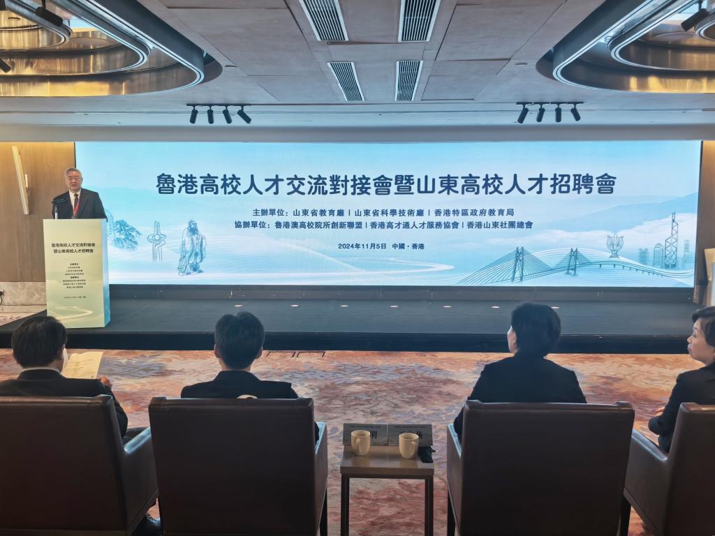 11月5日,鲁港高校人才交流对接会暨山东高校人才招聘会在香港举行。山东省委副书记、组织部部长王宇燕,香港特区政府教育局局长蔡若莲,中央政府驻港联络办教科部部长王伟明,省委港澳办主任张连三,省委教育工委常务副书记、省教育厅党组书记、厅长李明,省科学技术厅党组书记、厅长孙海生,省委组织部副部长龚文东,省委统战部副部长张静,济南市委常委、组织部部长陈阳,青岛市委常委、组织部部长于玉等领导出席会议。中国工程院院士、康复大学校长董尔丹应邀出席会议并致辞。