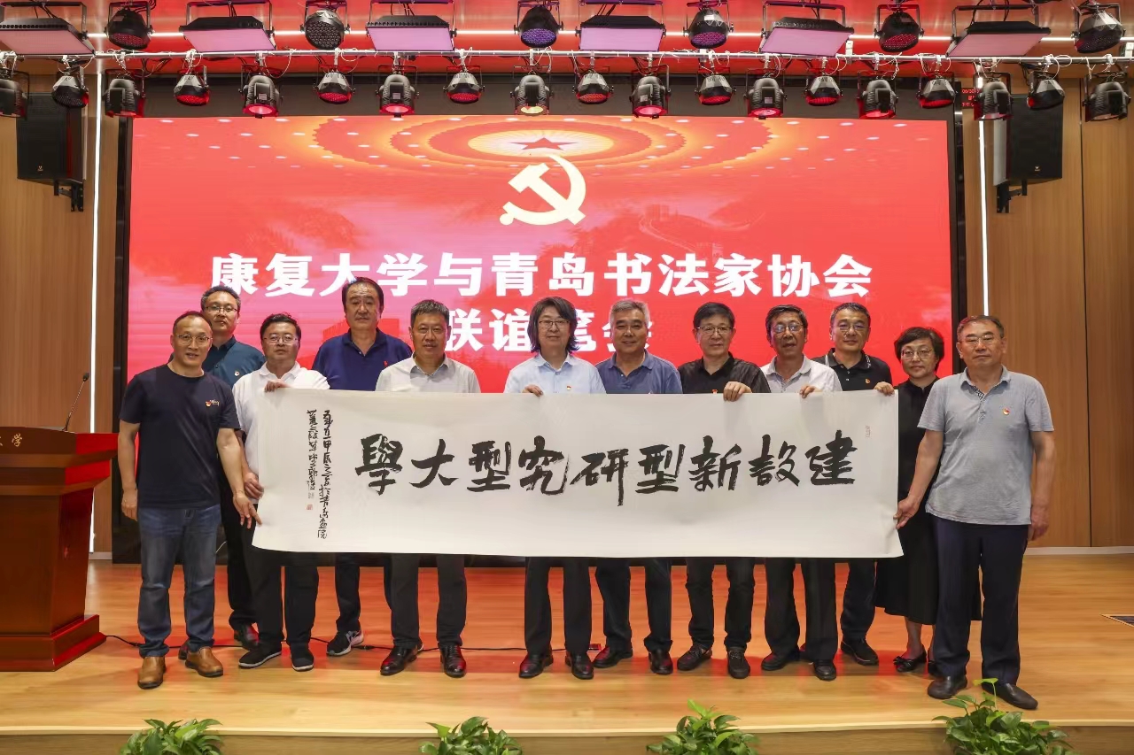 青岛市书法家协会向康复大学赠送“建设新型研究型大学”书法作品。
