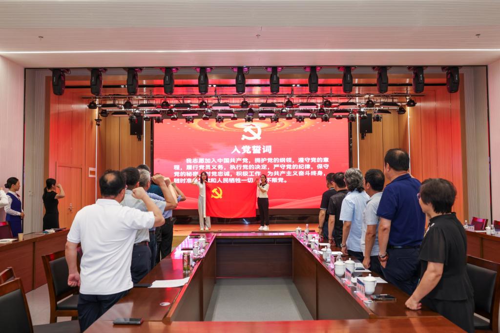活动开始,学校党员和青岛市书法家协会党员和面对党旗重温入党誓词。