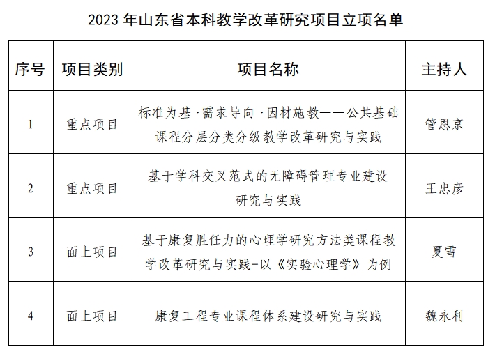 近日,山东省教育厅公布了2023年山东省本科教学改革研究项目立项名单,学校推荐的4项课题全部获批立项,其中重点项目2项,面上项目2项。