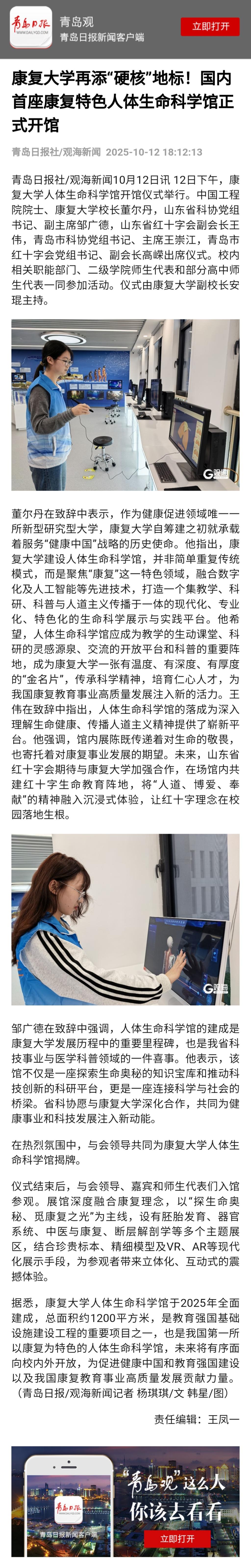 【青岛日报新闻客户端】康复大学再添“硬核”地标!国内首座康复特色人体生命科学馆正式开馆