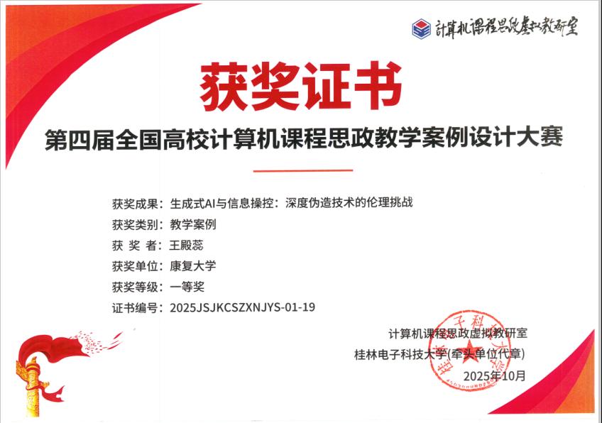 近日,第四届全国高校计算机课程思政教学案例设计大赛获奖名单正式公布。康复大学公共教学部王殿蕊老师参赛作品《生成式AI与信息操控:深度伪造技术的伦理挑战》荣获大赛一等奖,同时斩获"可信人工智能"赛道一等奖。该获奖作品聚焦生成式人工智能发展前沿,创新性地将技术原理与伦理教育深度融合,探索了人工智能赋能课程思政建设的新路径,展现了康复大学在交叉学科教学改革方面的创新成果。本次大赛由教育部计算机课程思政虚...