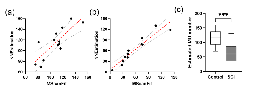 真实数据验证其泛化能力强,与临床预期一致。尽管NNEstimation完全基于仿真数据训练,在真实人体CMAP scan中仍表现出优秀的泛化能力:其估计结果与传统方法MScanFit高度相关,并能有效区分健康受试者与脊髓损伤患者——后者运动单位数量显著下降,与临床诊断一致。