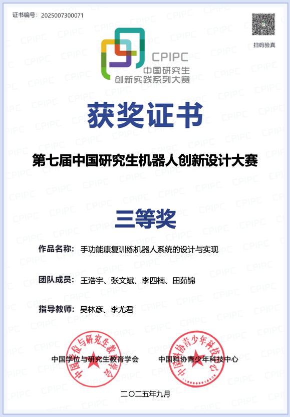 我校研究生团队在第七届中国研究生机器人创新设计大赛中,凭项目《手功能康复训练机器人系统的设计与实现》获得三等奖(2025年9月)。参赛团队成员为王浩宇、张文斌、李四楠、田茹锦、吴林彦、李尤君。