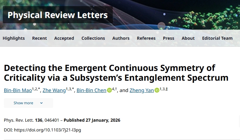近日,康复大学公共教学部(马克思主义学院)青年教师毛斌斌在国际知名期刊Physical Review Letters发表了题为“Detecting the (emergent) continuous symmetry of criticality via a subsystem’s entanglement spectrum”的论文。量子临界点所蕴含的对称性信息,是理解相变普适性与有效场论的关键。然而,如何在不预知有效场论的前提下,直接无偏地探测临界点是否存在(演生)连续对称性,一直是量子多体物理中的难题。该研究...