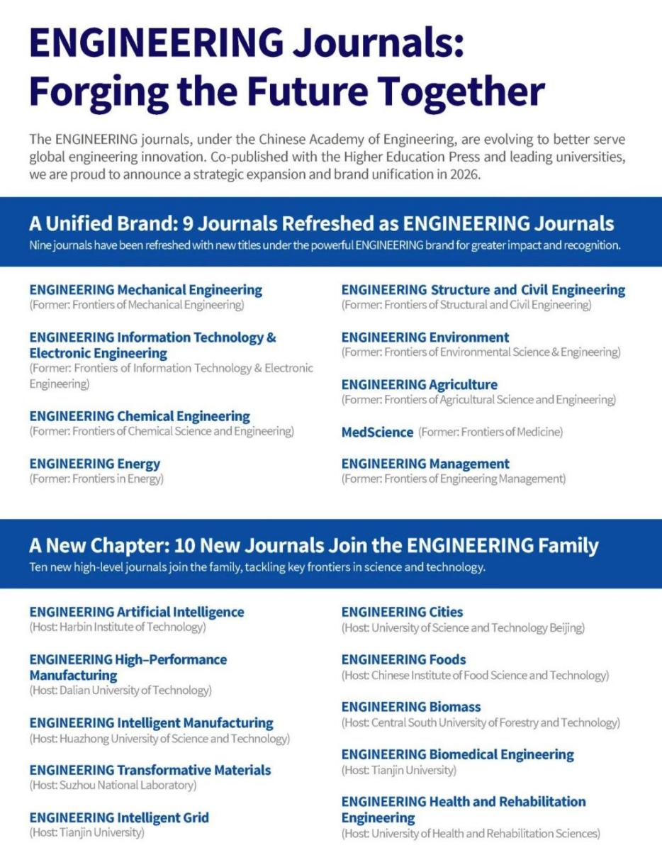 近日,中国工程院在北京召开“中国工程院Engineering刊群建设与发展会议”,正式发布“1+19”工程科技刊群体系。刊群在原有1本旗舰主刊《Engineering》(影响因子11.6,工程综合类世界排名前3)和9本子刊的基础上,对原有子刊重新命名,并新增10本子刊。Engineering期刊群将建设成为世界一流科技刊群,全面提升我国在国际工程科技领域的话语权与影响力。康复大学作为依托主办单位,新创办《ENGINEERING Health&Rehabilitation E...
